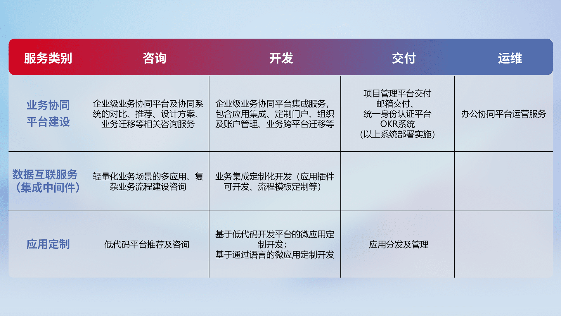 针对钉钉、、、、企微、、、、IDaas等平台级产品提供产品的规划、、、、方案、、、、交付、、定制化开发等服务,,实现如统一协同办公、、智能客户服务、、、、混合会议管理、、、智能数据查询、、、等业务场景,,实现数字化转型。。。